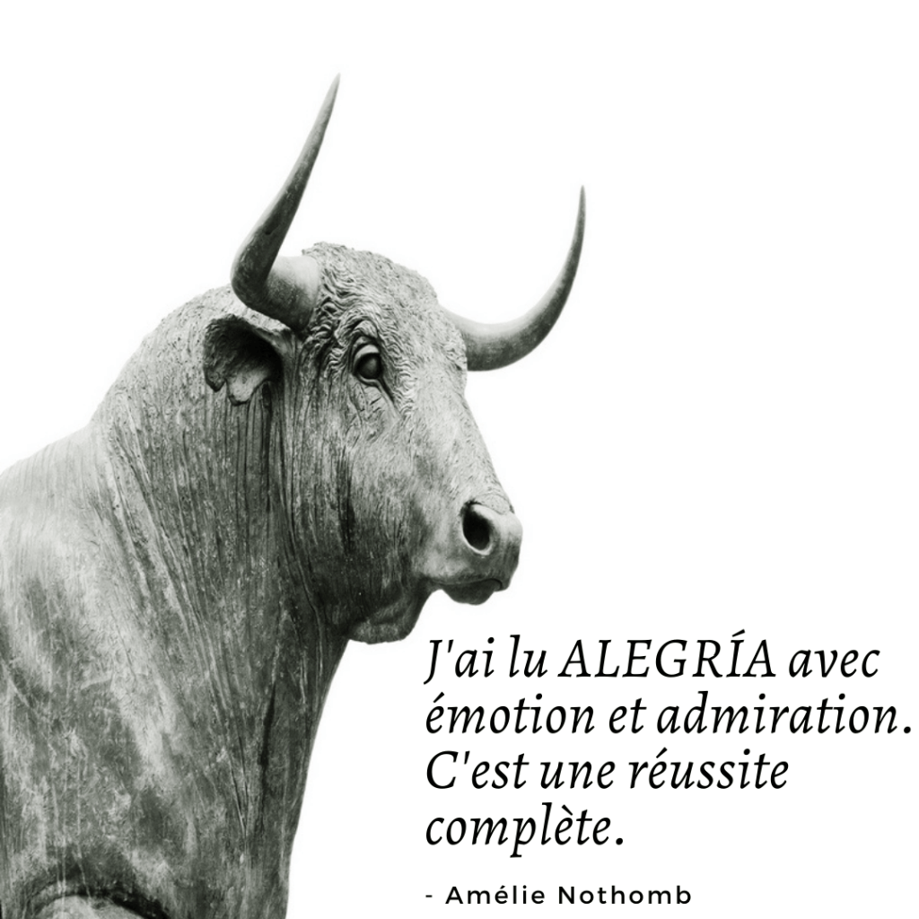 Connaissant ses engagements en tant que fan de sa plume, l’idée m’est venue de lui envoyer Alegría. Amélie Nothomb l’a lu et l’a beaucoup apprécié. Elle m’a écrit pour me faire part de son ressenti.